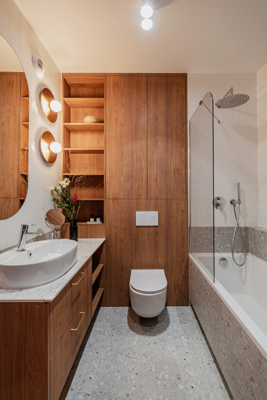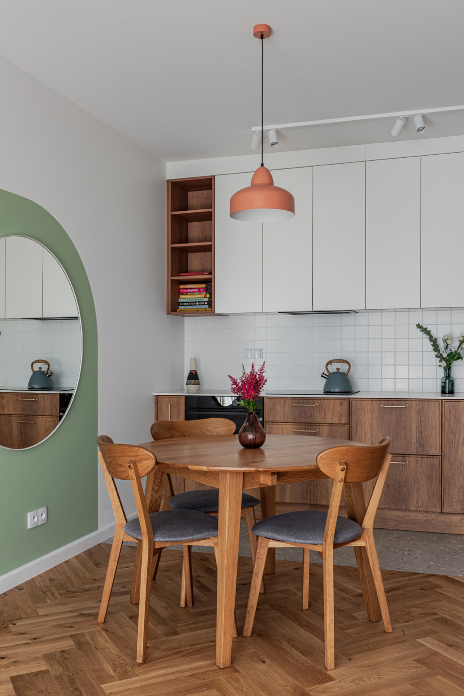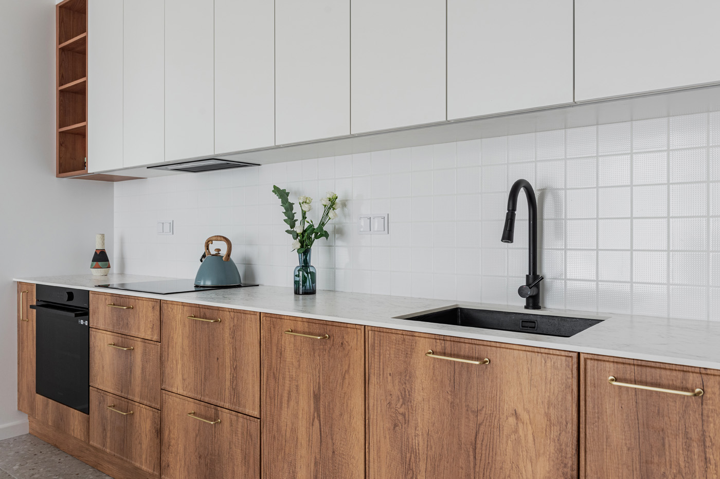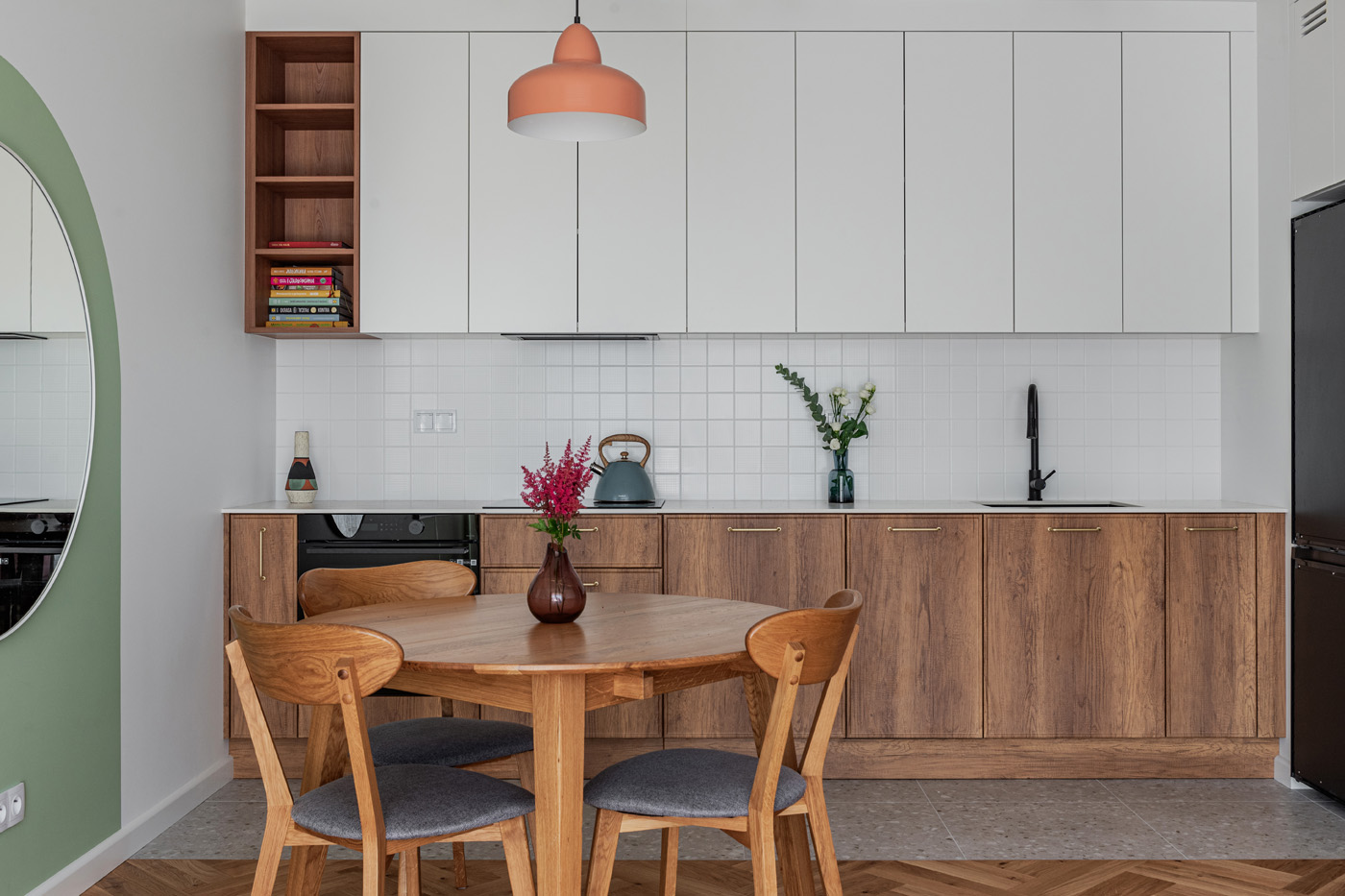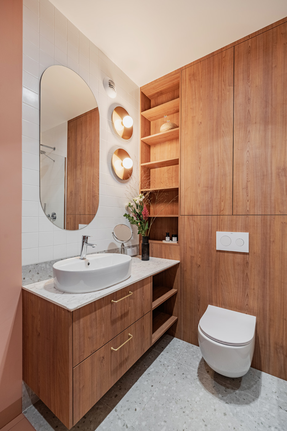 Zabudowy meblowe w tej realizacji opierają się na wyraźnym rysunku frontów imitujących drewno, które nadają wnętrzu ciepłego charakteru. W kuchni dolne szafki o dekorze drewna zestawiono z lekką, jasną zabudową górną, dzięki czemu kompozycja pozostaje wizualnie uporządkowana. Smukłe, mosiężne uchwyty wprowadzają elegancki detal, a otwarta wnęka z półkami przełamuje rytm jednolitych frontów. Ten sam dekor pojawia się w łazience – w zabudowie wokół stelaża oraz w szafce pod umywalką – tworząc spójną stylistycznie całość.