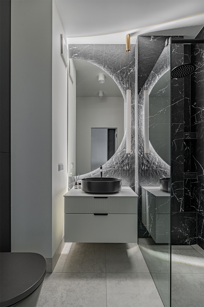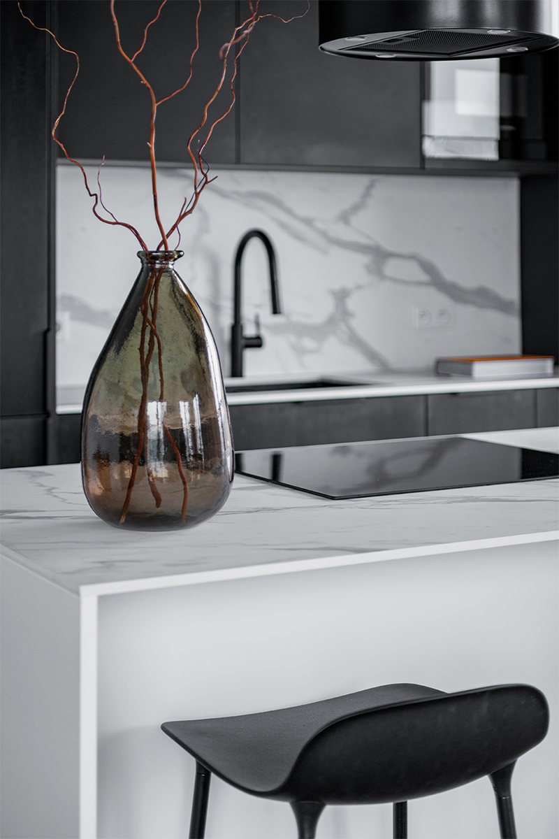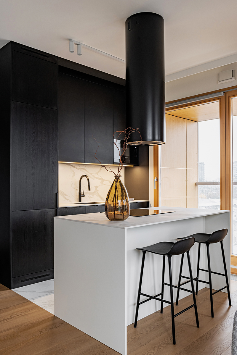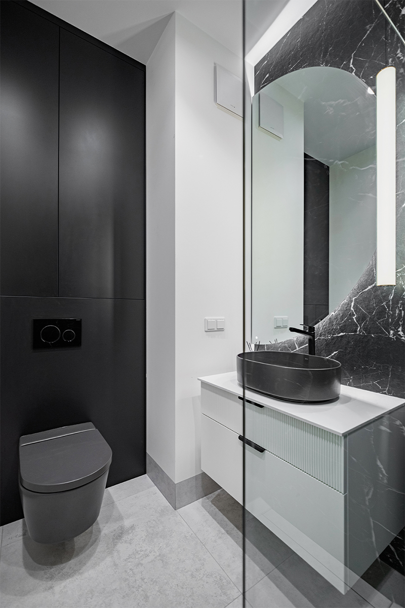 Zabudowy budują tu wyrazistą, architektoniczną kompozycję. W kuchni czarne, matowe fronty tworzą jednolitą bryłę wysokiej zabudowy, kontrastując z jasną wyspą o monolitycznej formie i kamiennym blacie. Podświetlona wnęka z rysunkiem marmuru nadaje głębi i elegancji. Minimalistyczne podziały frontów podkreślają precyzję stolarską. W łazience czarna zabudowa ukrywa funkcje techniczne, a frezowany front szafki pod umywalką wprowadza subtelny detal.
