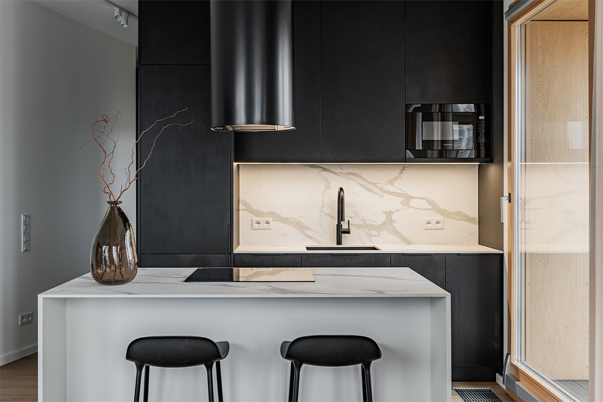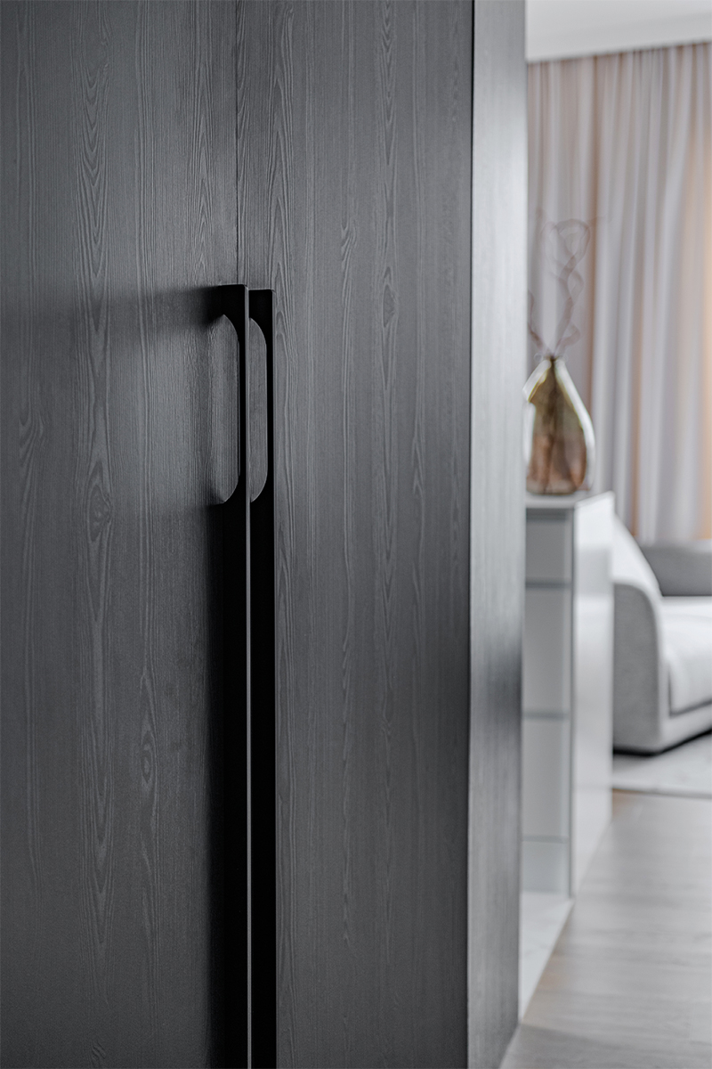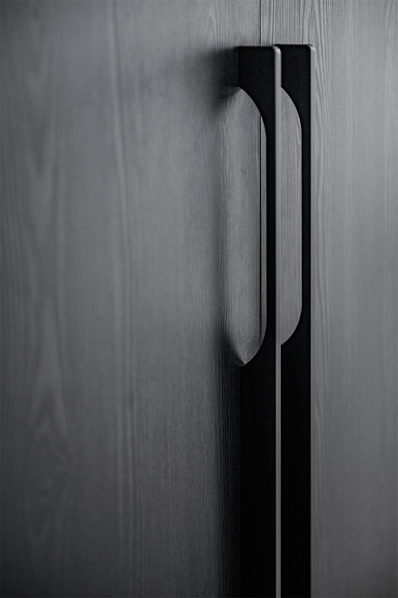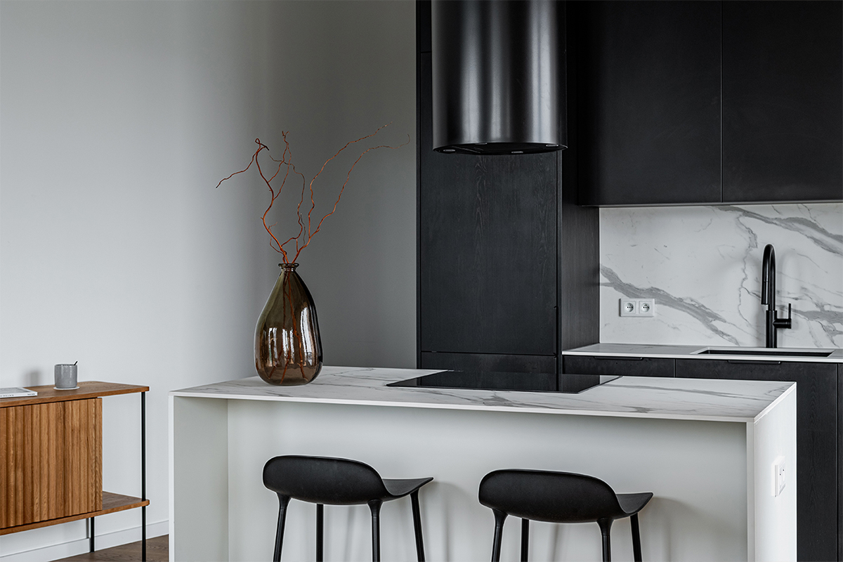 Zabudowy budują tu wyrazistą, architektoniczną kompozycję. W kuchni czarne, matowe fronty tworzą jednolitą bryłę wysokiej zabudowy, kontrastując z jasną wyspą o monolitycznej formie i kamiennym blacie. Podświetlona wnęka z rysunkiem marmuru nadaje głębi i elegancji. Minimalistyczne podziały frontów podkreślają precyzję stolarską. W łazience czarna zabudowa ukrywa funkcje techniczne, a frezowany front szafki pod umywalką wprowadza subtelny detal.