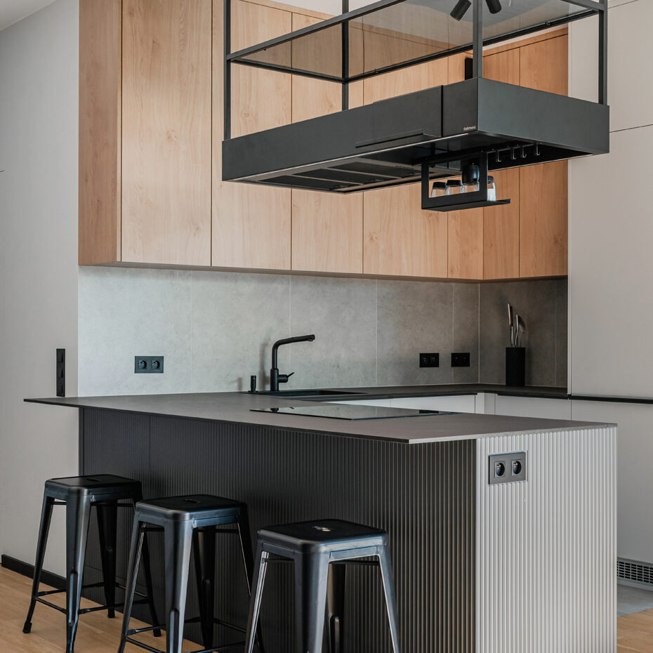 Zabudowy meblowe w tej kuchni to świadome połączenie gładkich frontów w odcieniu jasnego drewna z grafitowymi powierzchniami o ryflowanej strukturze. Masywna wyspa zintegrowana z industrialną nadstawką przyciąga wzrok i porządkuje przestrzeń. W łazience układ mebli powtarza ten sam zestaw kolorystyczny, zapewniając spójność całej realizacji.