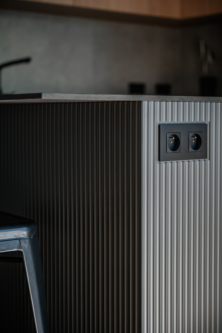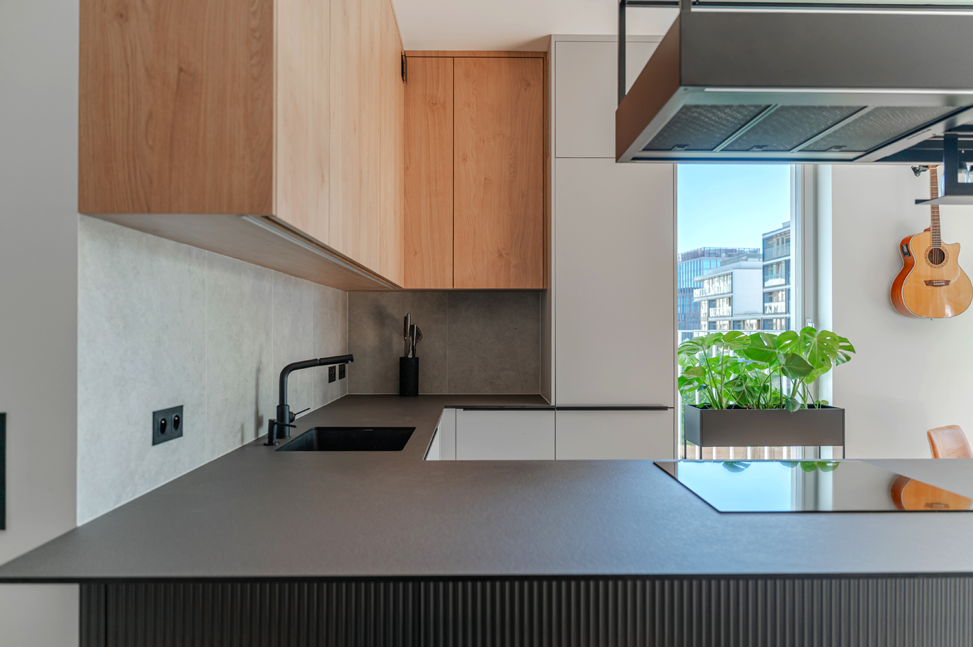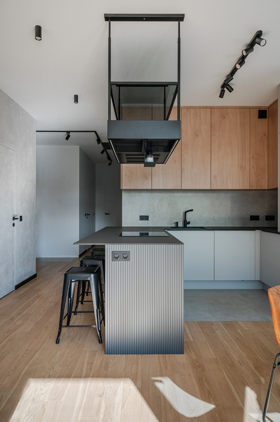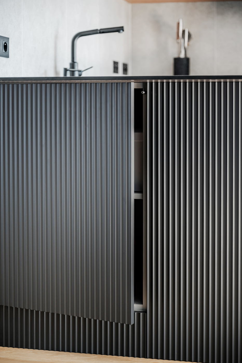 Zabudowy meblowe w tej kuchni to świadome połączenie gładkich frontów w odcieniu jasnego drewna z grafitowymi powierzchniami o ryflowanej strukturze. Masywna wyspa zintegrowana z industrialną nadstawką przyciąga wzrok i porządkuje przestrzeń. W łazience układ mebli powtarza ten sam zestaw kolorystyczny, zapewniając spójność całej realizacji.