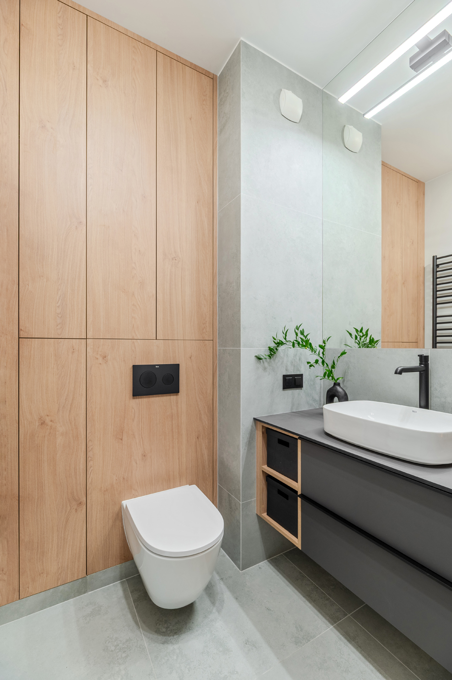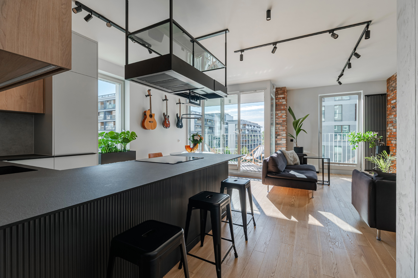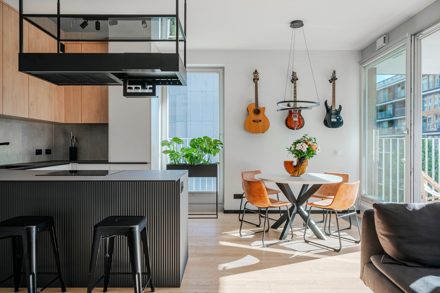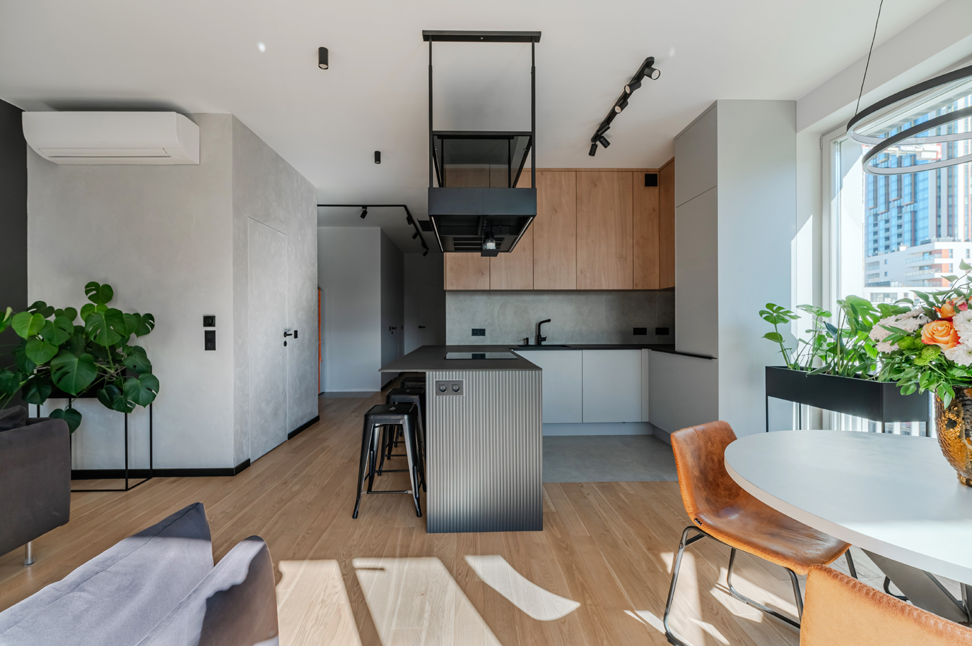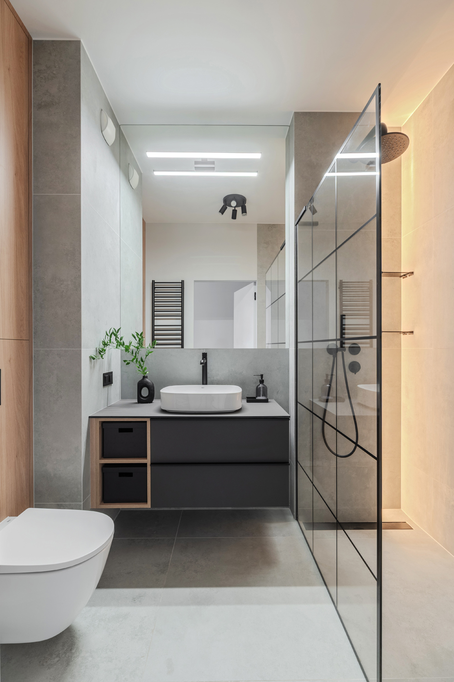 Zabudowy meblowe w tej kuchni to świadome połączenie gładkich frontów w odcieniu jasnego drewna z grafitowymi powierzchniami o ryflowanej strukturze. Masywna wyspa zintegrowana z industrialną nadstawką przyciąga wzrok i porządkuje przestrzeń. W łazience układ mebli powtarza ten sam zestaw kolorystyczny, zapewniając spójność całej realizacji.