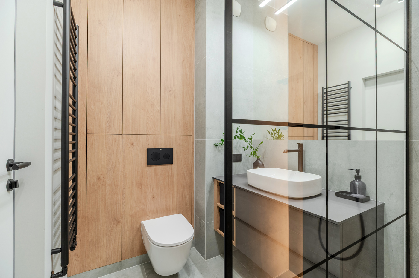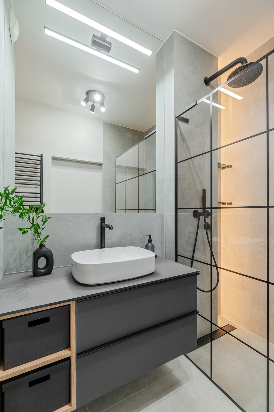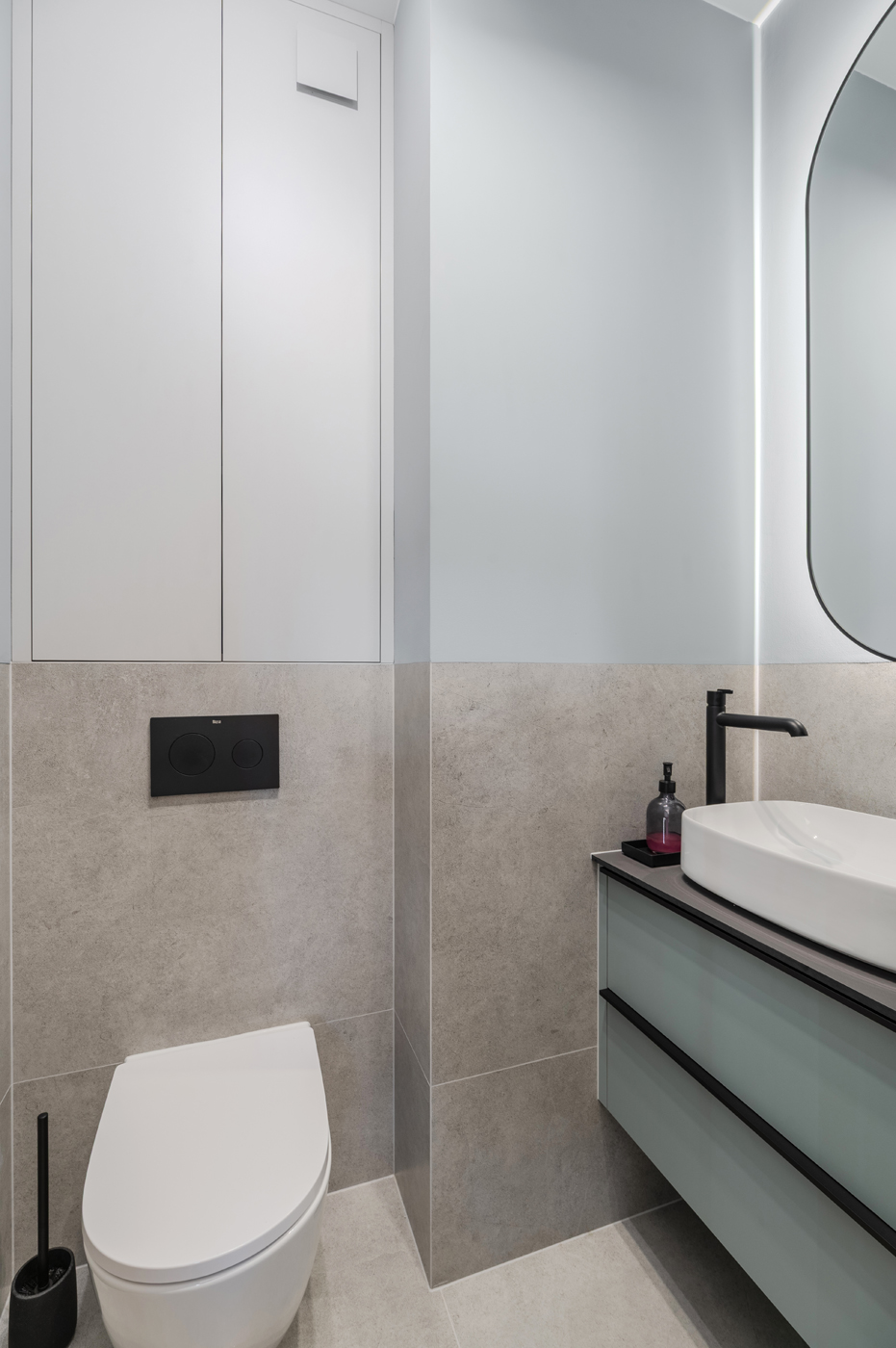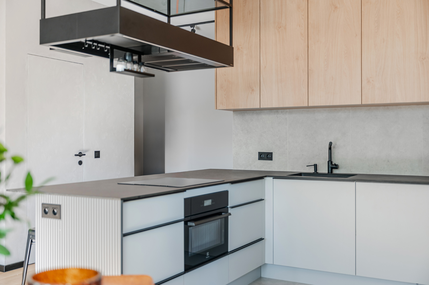 Zabudowy meblowe w tej kuchni to świadome połączenie gładkich frontów w odcieniu jasnego drewna z grafitowymi powierzchniami o ryflowanej strukturze. Masywna wyspa zintegrowana z industrialną nadstawką przyciąga wzrok i porządkuje przestrzeń. W łazience układ mebli powtarza ten sam zestaw kolorystyczny, zapewniając spójność całej realizacji.