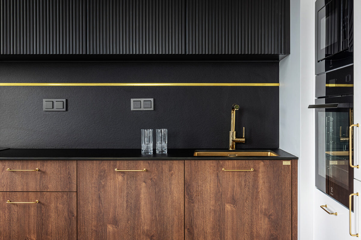 Zabudowy meblowe w tym apartamencie łączą ciemne, ryflowane fronty z ciepłym odcieniem drewna i matową bielą. Kuchnię wyróżniają złote detale – uchwyty, armatura i ozdobna listwa wzdłuż ściany, która spaja kompozycję. Wyrazistym akcentem strefy dziennej jest również ażurowa ścianka z lameli, która subtelnie dzieli przestrzeń bez zaburzania jej otwartości. Całość ma elegancki, nowoczesny charakter i przyciąga wzrok przemyślaną geometrią oraz kontrastem faktur.