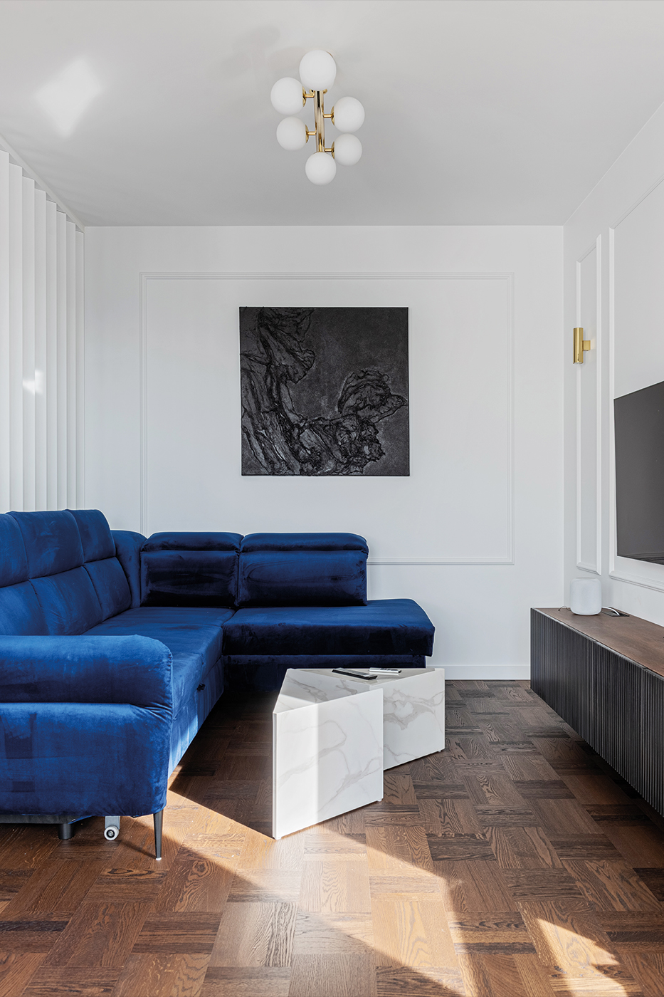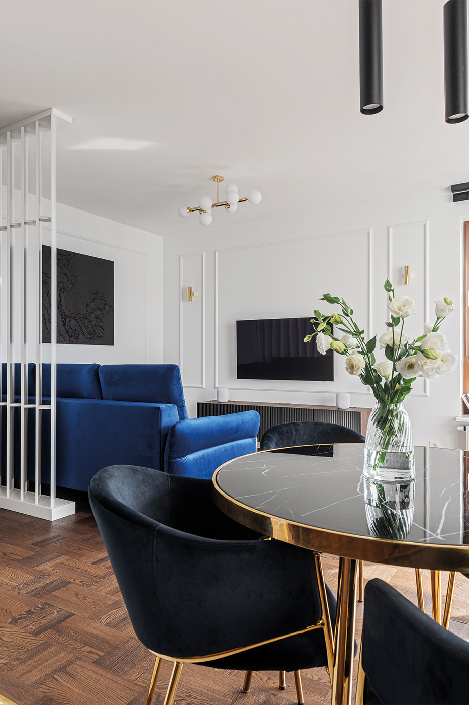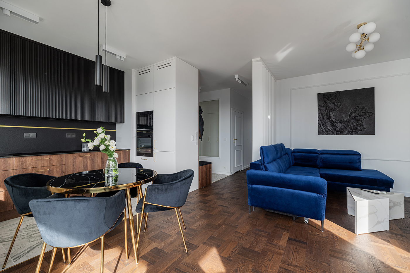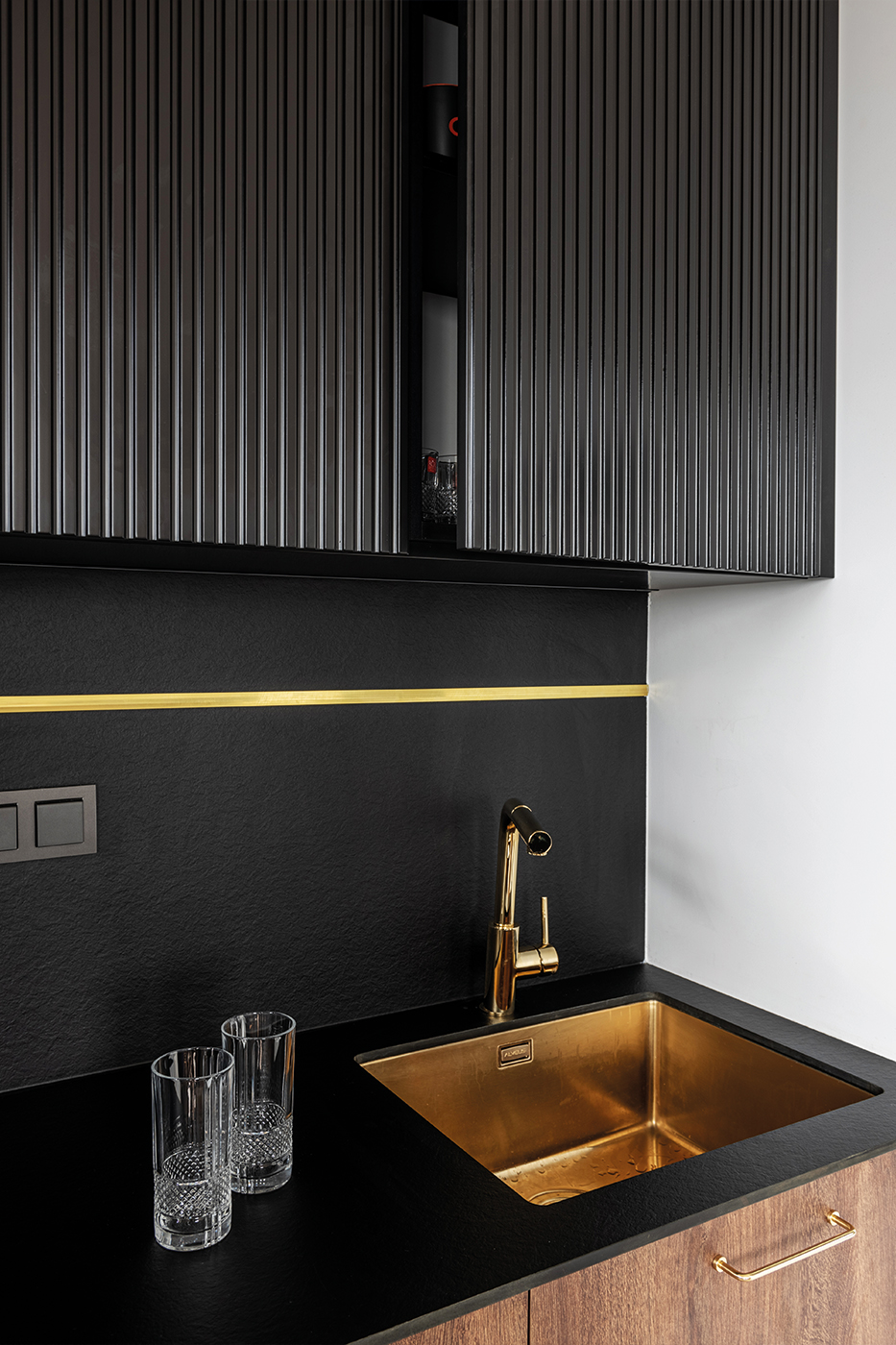 Zabudowy meblowe w tym apartamencie łączą ciemne, ryflowane fronty z ciepłym odcieniem drewna i matową bielą. Kuchnię wyróżniają złote detale – uchwyty, armatura i ozdobna listwa wzdłuż ściany, która spaja kompozycję. Wyrazistym akcentem strefy dziennej jest również ażurowa ścianka z lameli, która subtelnie dzieli przestrzeń bez zaburzania jej otwartości. Całość ma elegancki, nowoczesny charakter i przyciąga wzrok przemyślaną geometrią oraz kontrastem faktur.