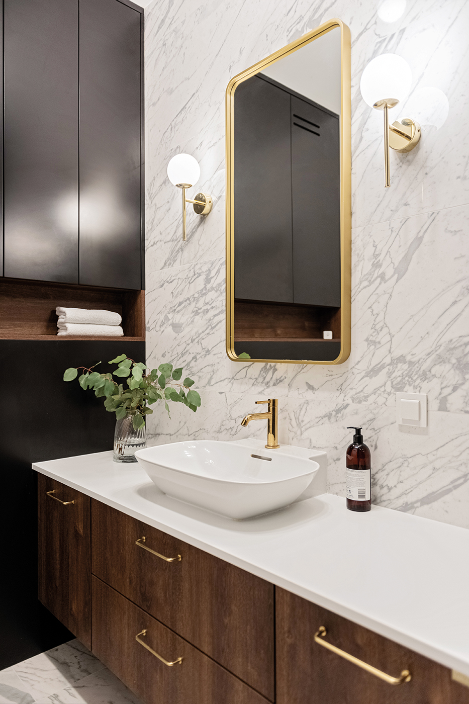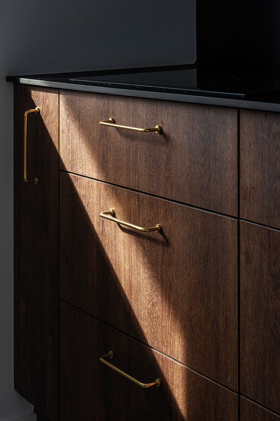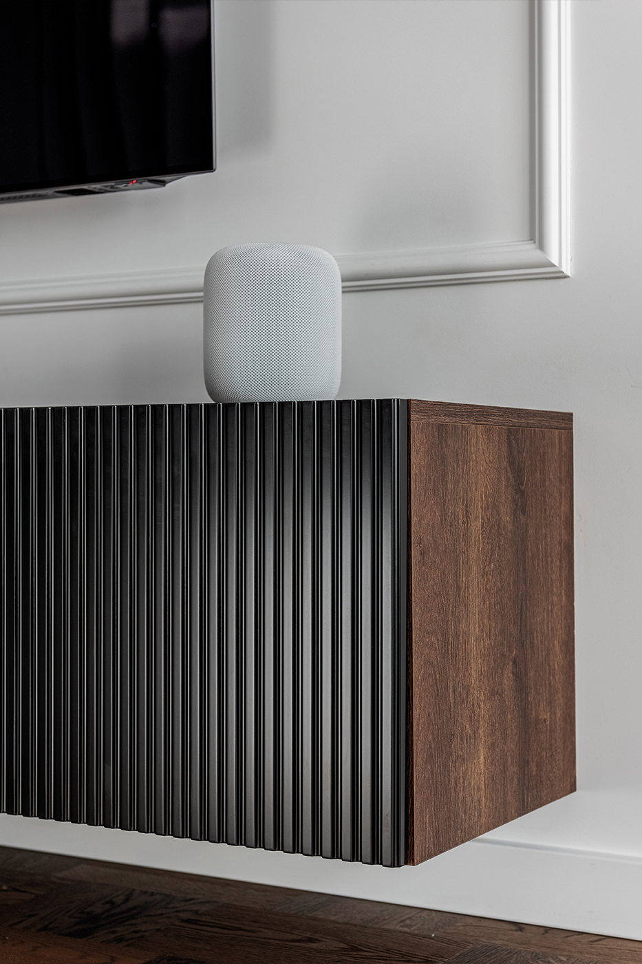 Zabudowy meblowe w tym apartamencie łączą ciemne, ryflowane fronty z ciepłym odcieniem drewna i matową bielą. Kuchnię wyróżniają złote detale – uchwyty, armatura i ozdobna listwa wzdłuż ściany, która spaja kompozycję. Wyrazistym akcentem strefy dziennej jest również ażurowa ścianka z lameli, która subtelnie dzieli przestrzeń bez zaburzania jej otwartości. Całość ma elegancki, nowoczesny charakter i przyciąga wzrok przemyślaną geometrią oraz kontrastem faktur.