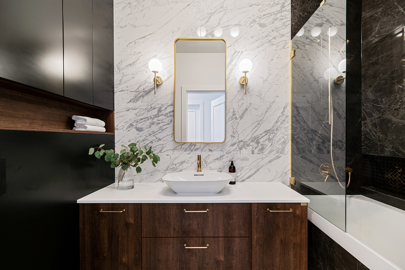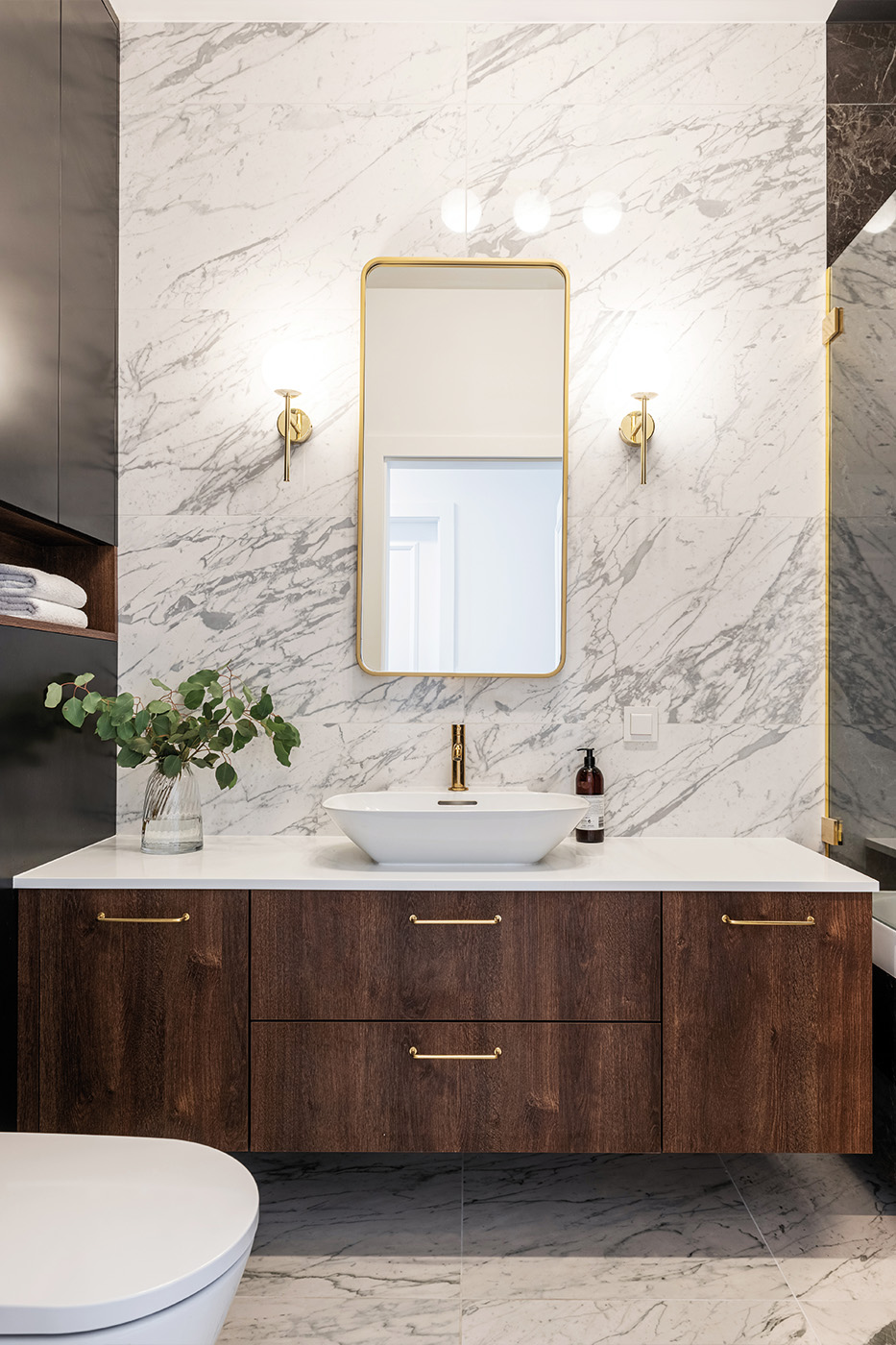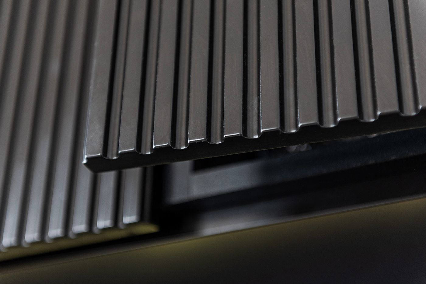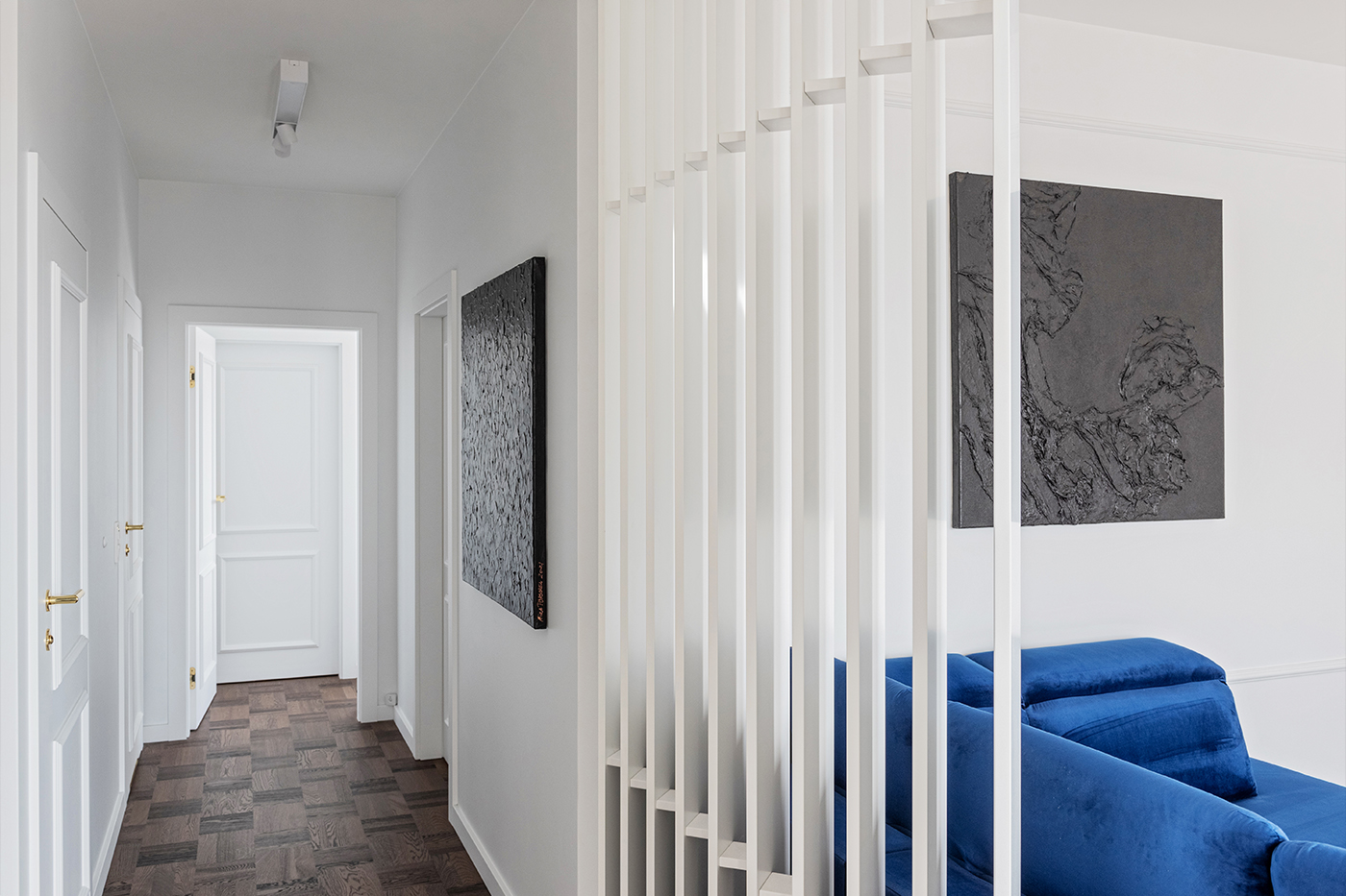 Zabudowy meblowe w tym apartamencie łączą ciemne, ryflowane fronty z ciepłym odcieniem drewna i matową bielą. Kuchnię wyróżniają złote detale – uchwyty, armatura i ozdobna listwa wzdłuż ściany, która spaja kompozycję. Wyrazistym akcentem strefy dziennej jest również ażurowa ścianka z lameli, która subtelnie dzieli przestrzeń bez zaburzania jej otwartości. Całość ma elegancki, nowoczesny charakter i przyciąga wzrok przemyślaną geometrią oraz kontrastem faktur.